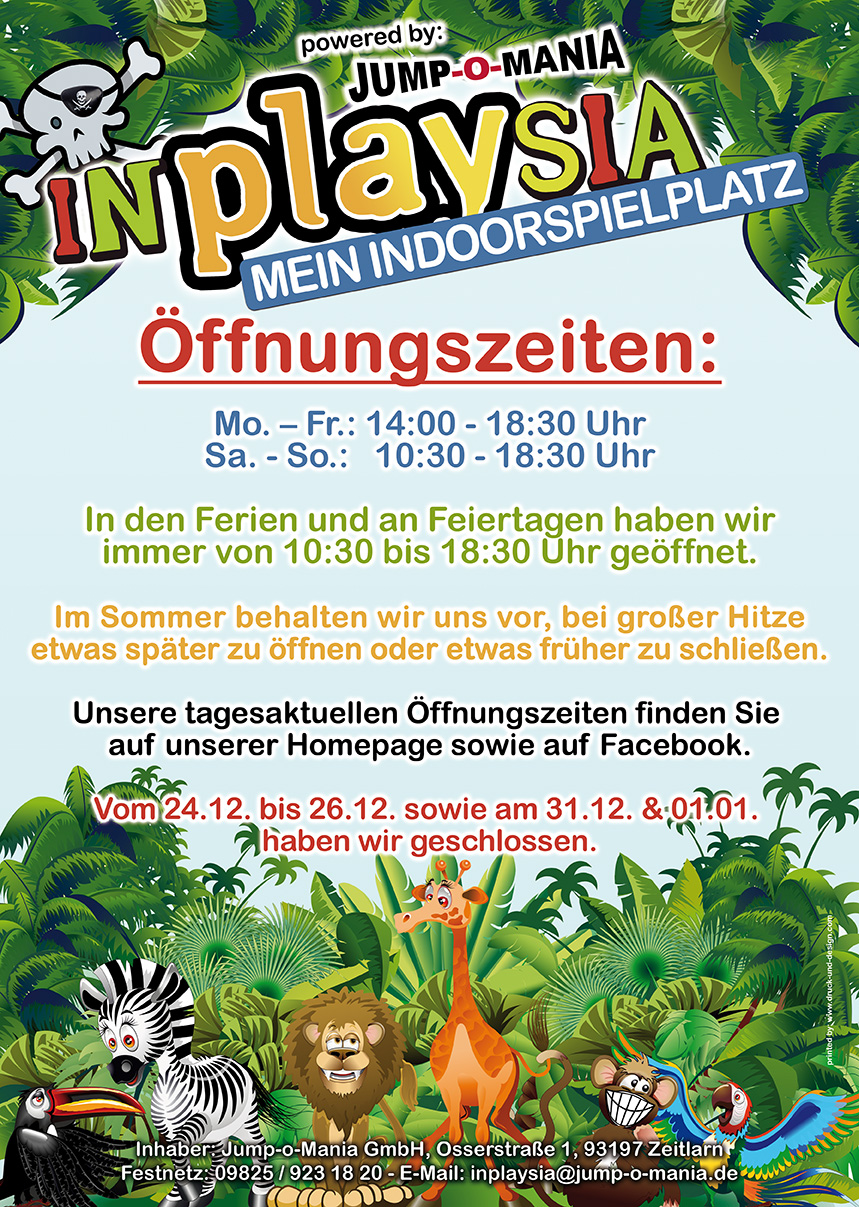 Öffnungszeiten Inplaysia Indoorspielplatz!